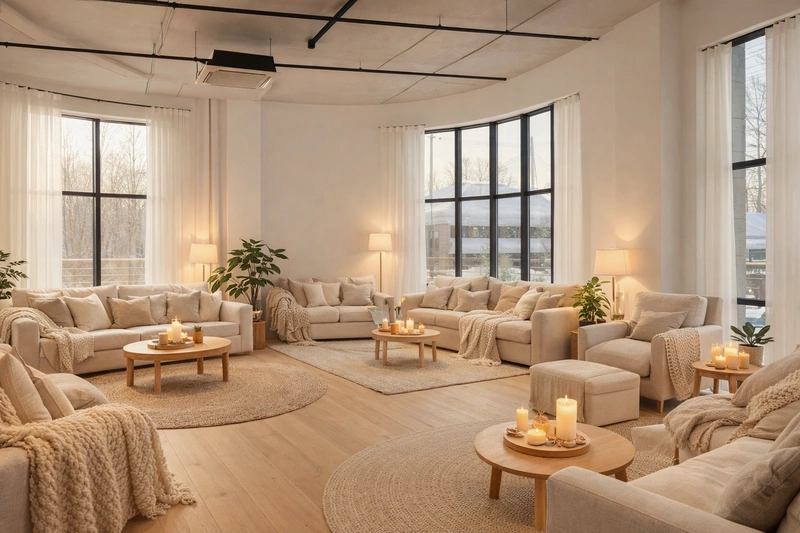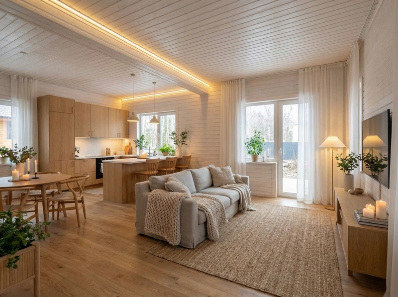 Уютный скандинавский стиль с акцентом на комфорт и тёплую атмосферу. Натуральные материалы, мягкие текстуры и приглушённые тона создают ощущение домашнего тепла и спокойствия.