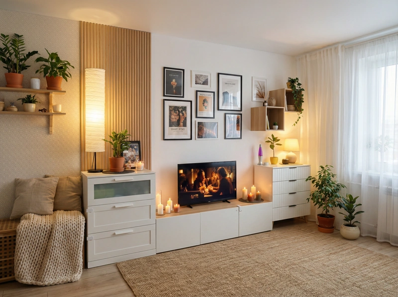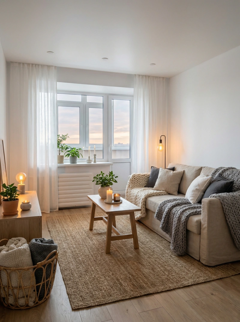 Уютный скандинавский стиль с акцентом на комфорт и тёплую атмосферу. Натуральные материалы, мягкие текстуры и приглушённые тона создают ощущение домашнего тепла и спокойствия.