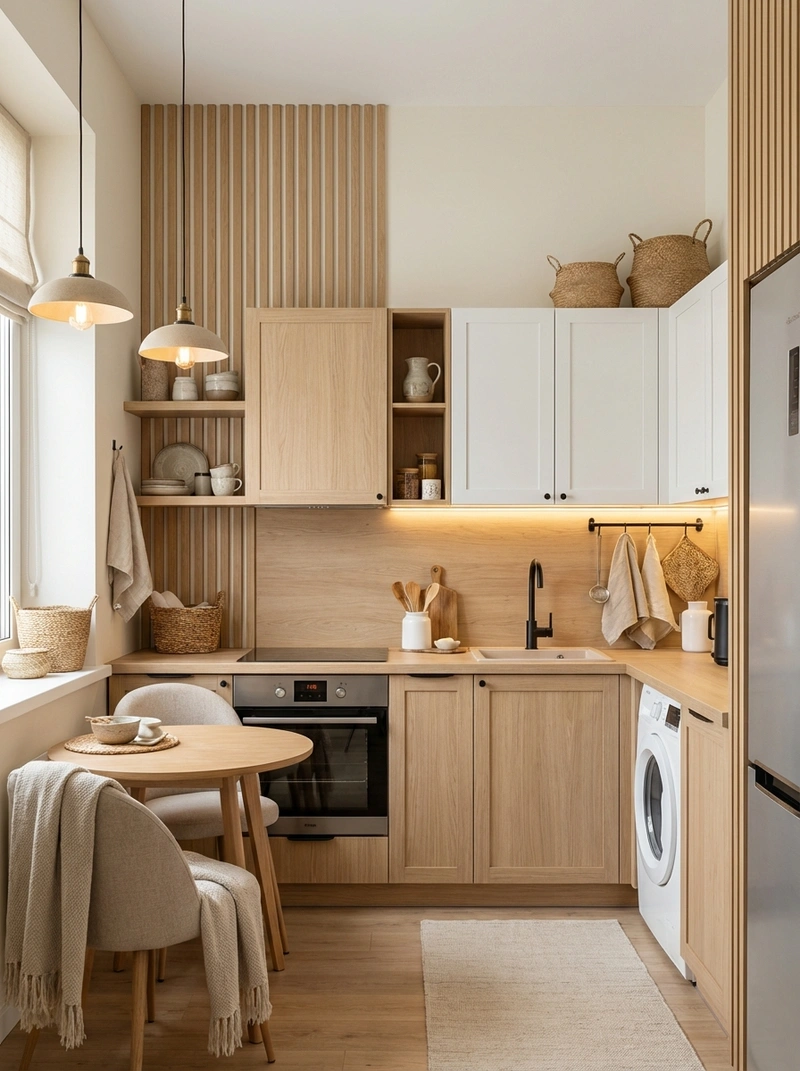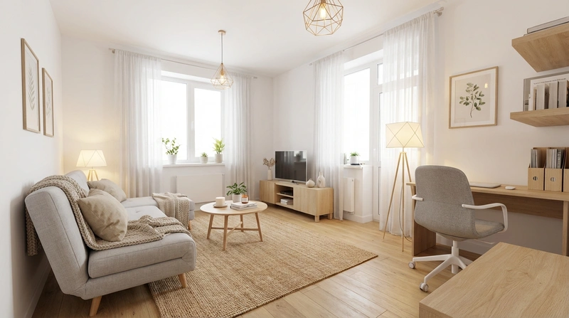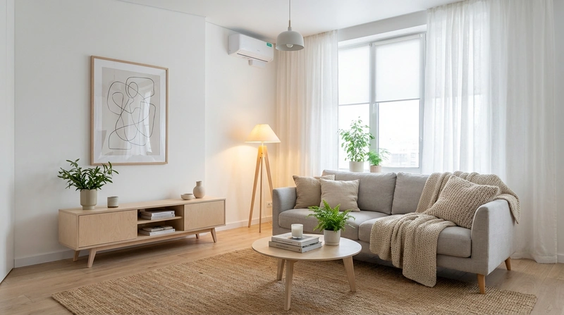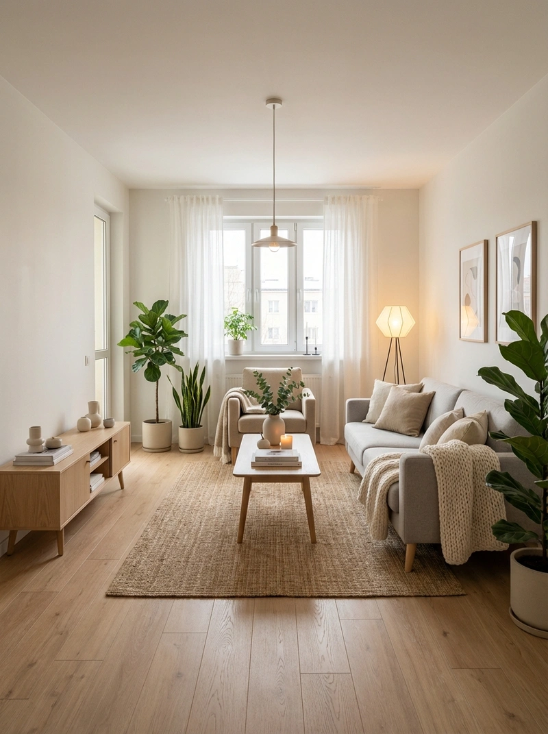 Уютный скандинавский стиль с акцентом на комфорт и тёплую атмосферу. Натуральные материалы, мягкие текстуры и приглушённые тона создают ощущение домашнего тепла и спокойствия.
