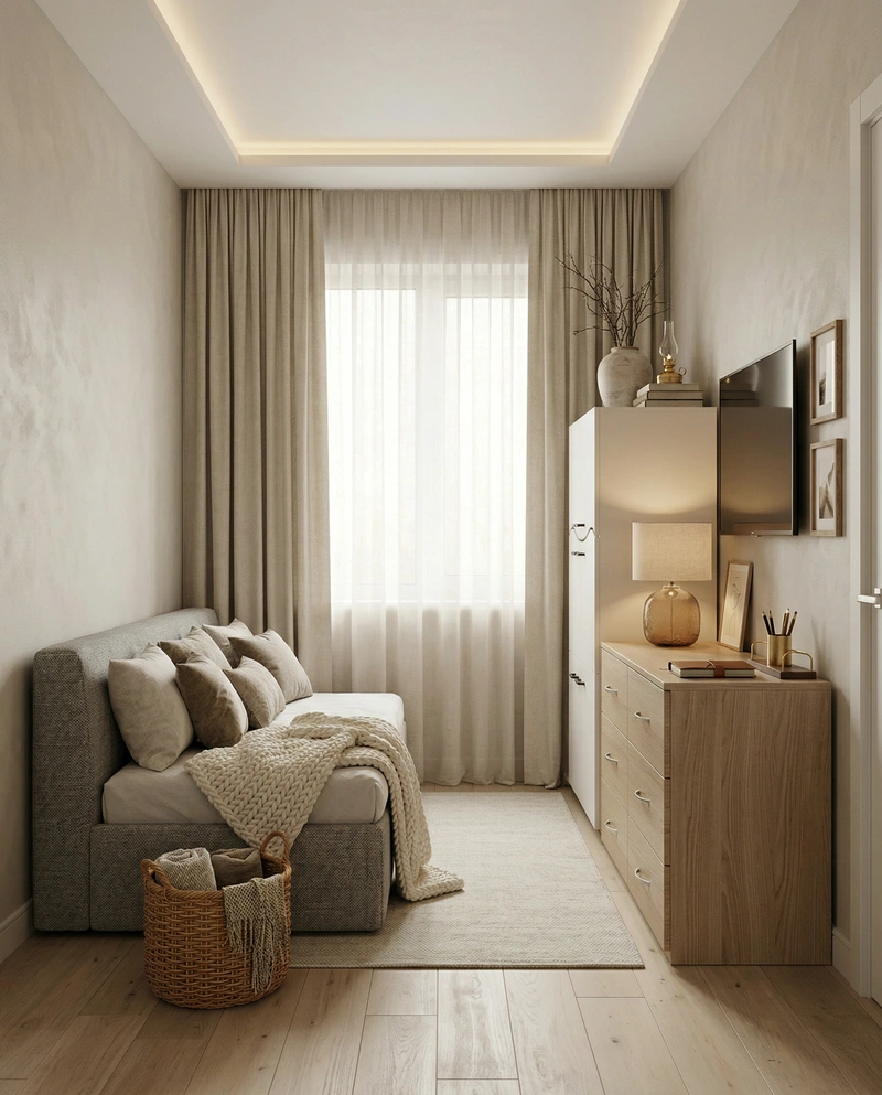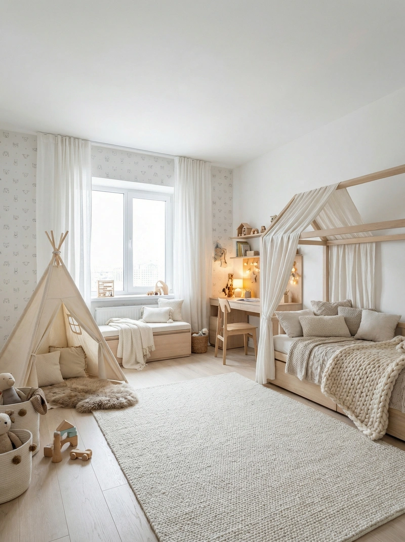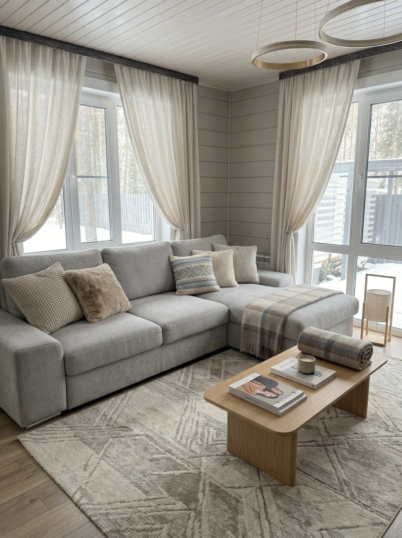 Уютный скандинавский стиль с акцентом на комфорт и тёплую атмосферу. Натуральные материалы, мягкие текстуры и приглушённые тона создают ощущение домашнего тепла и спокойствия.