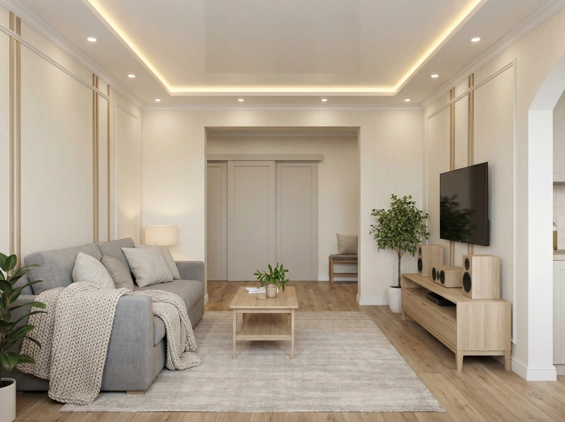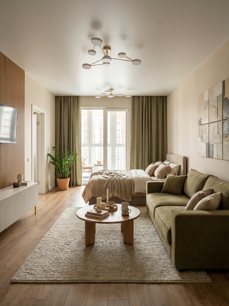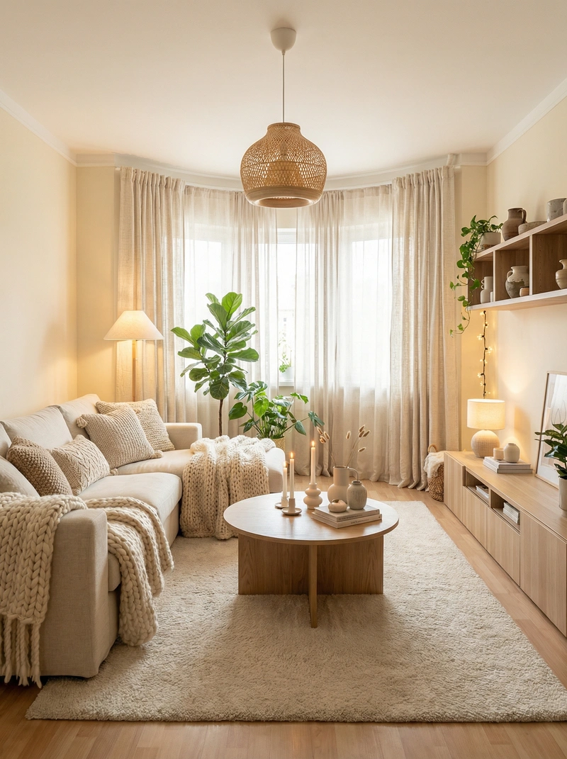 Уютный скандинавский стиль с акцентом на комфорт и тёплую атмосферу. Натуральные материалы, мягкие текстуры и приглушённые тона создают ощущение домашнего тепла и спокойствия.