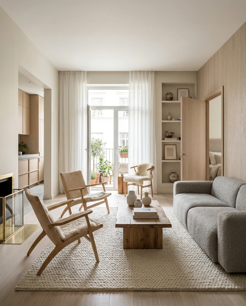 Уютный скандинавский стиль с акцентом на комфорт и тёплую атмосферу. Натуральные материалы, мягкие текстуры и приглушённые тона создают ощущение домашнего тепла и спокойствия.