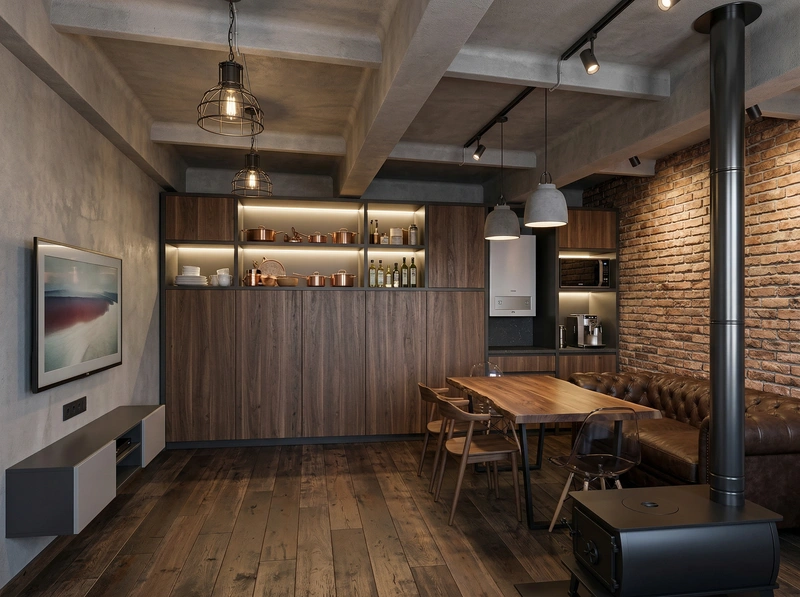 Индустриальный стиль с кирпичными стенами, открытыми коммуникациями и металлическими элементами. Лофт создаёт атмосферу творческого пространства с характером.