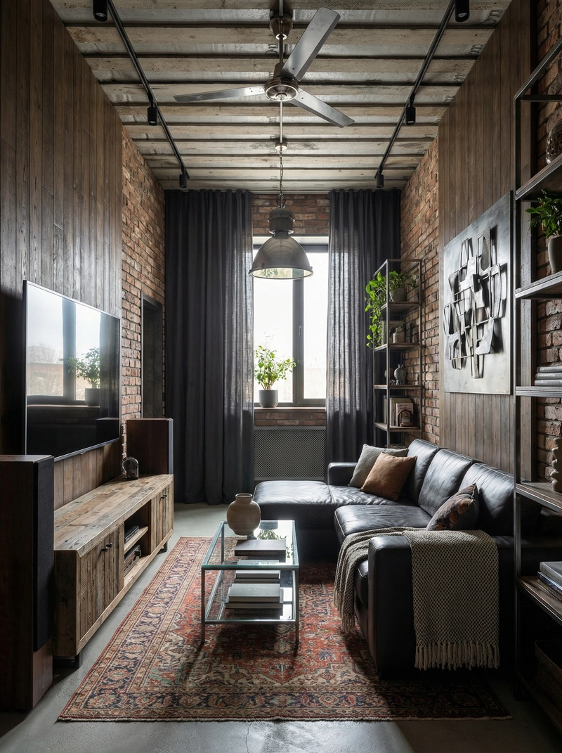 Индустриальный стиль с кирпичными стенами, открытыми коммуникациями и металлическими элементами. Лофт создаёт атмосферу творческого пространства с характером.