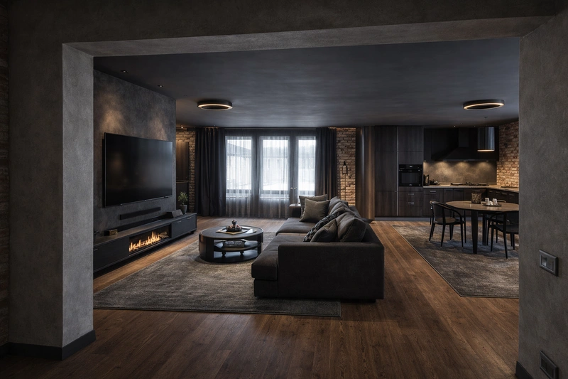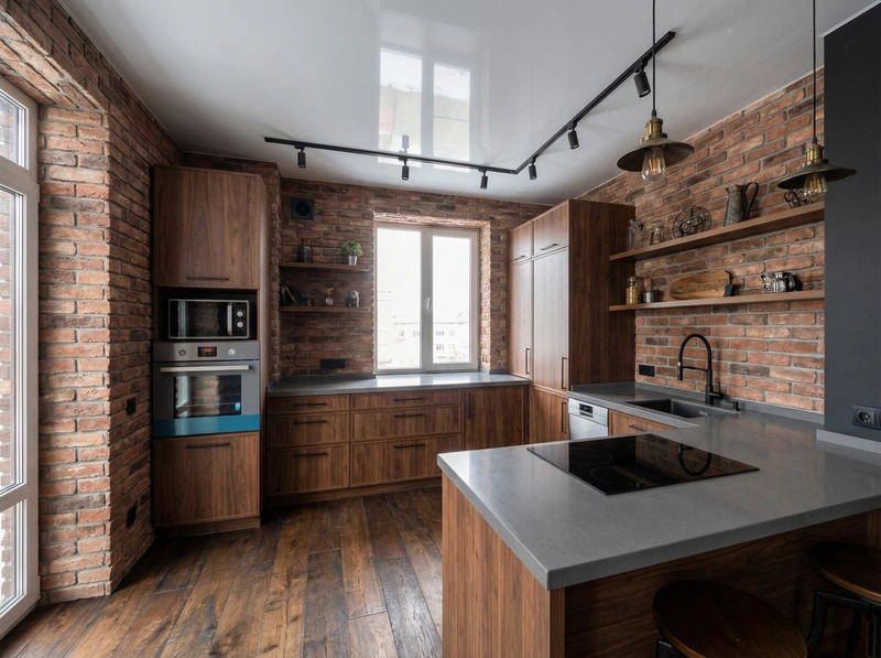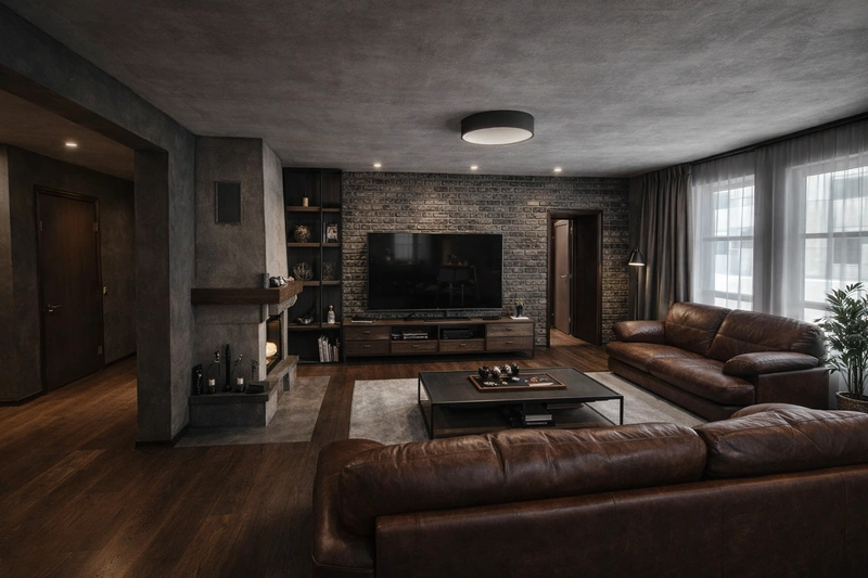 Индустриальный стиль с кирпичными стенами, открытыми коммуникациями и металлическими элементами. Лофт создаёт атмосферу творческого пространства с характером.