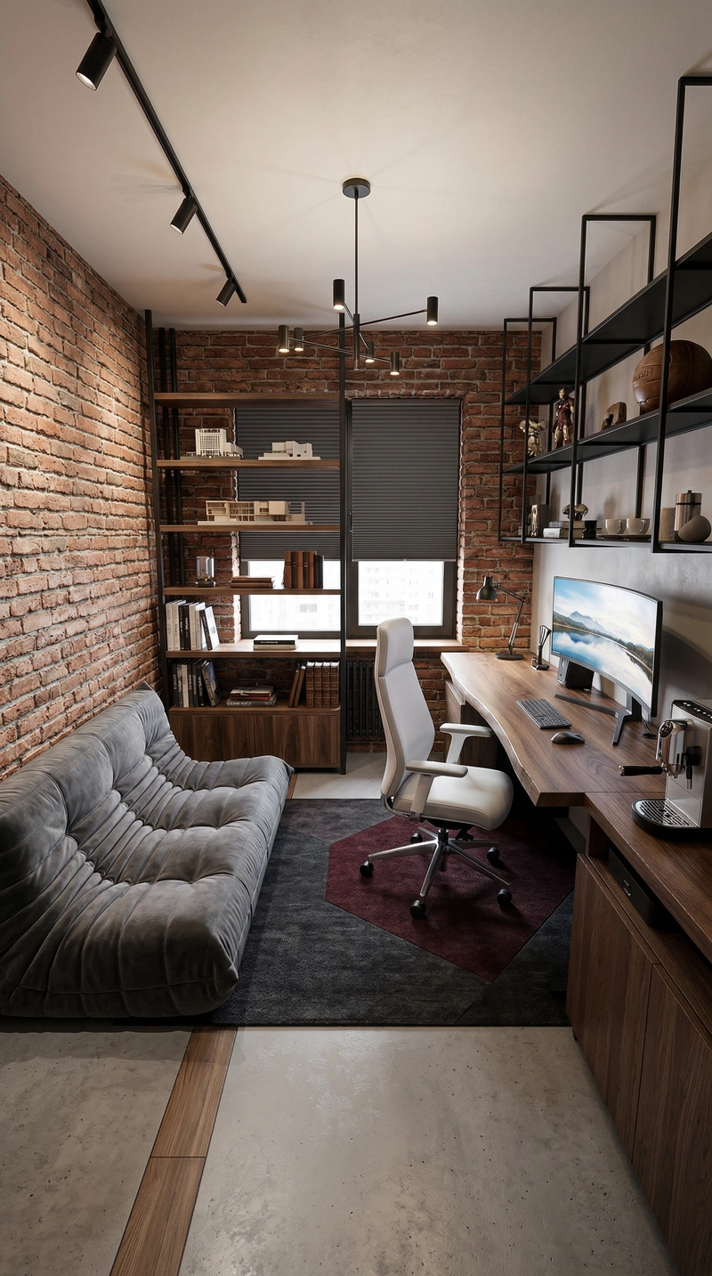 Индустриальный стиль с кирпичными стенами, открытыми коммуникациями и металлическими элементами. Лофт создаёт атмосферу творческого пространства с характером.
