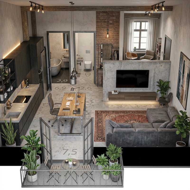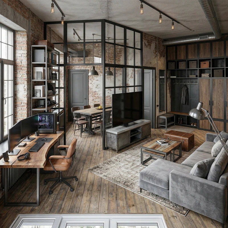 Индустриальный стиль с кирпичными стенами, открытыми коммуникациями и металлическими элементами. Лофт создаёт атмосферу творческого пространства с характером.
