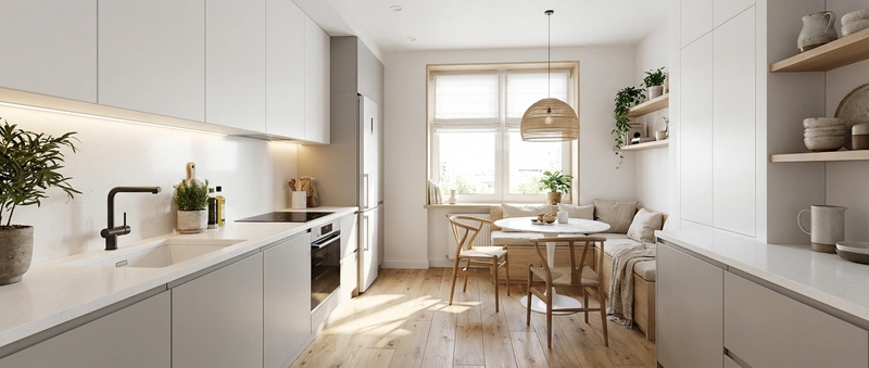 Светлый и воздушный скандинавский стиль. Белые стены, деревянные полы, функциональная мебель и яркие акценты создают лёгкое и практичное пространство.