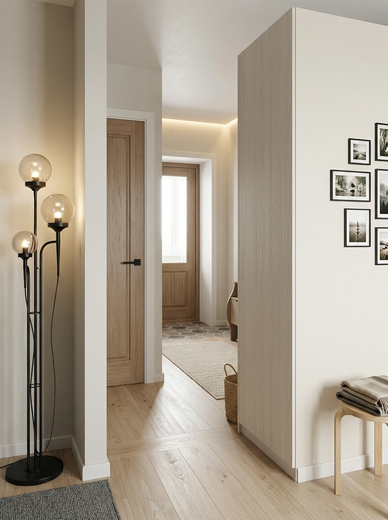 Светлый и воздушный скандинавский стиль. Белые стены, деревянные полы, функциональная мебель и яркие акценты создают лёгкое и практичное пространство.